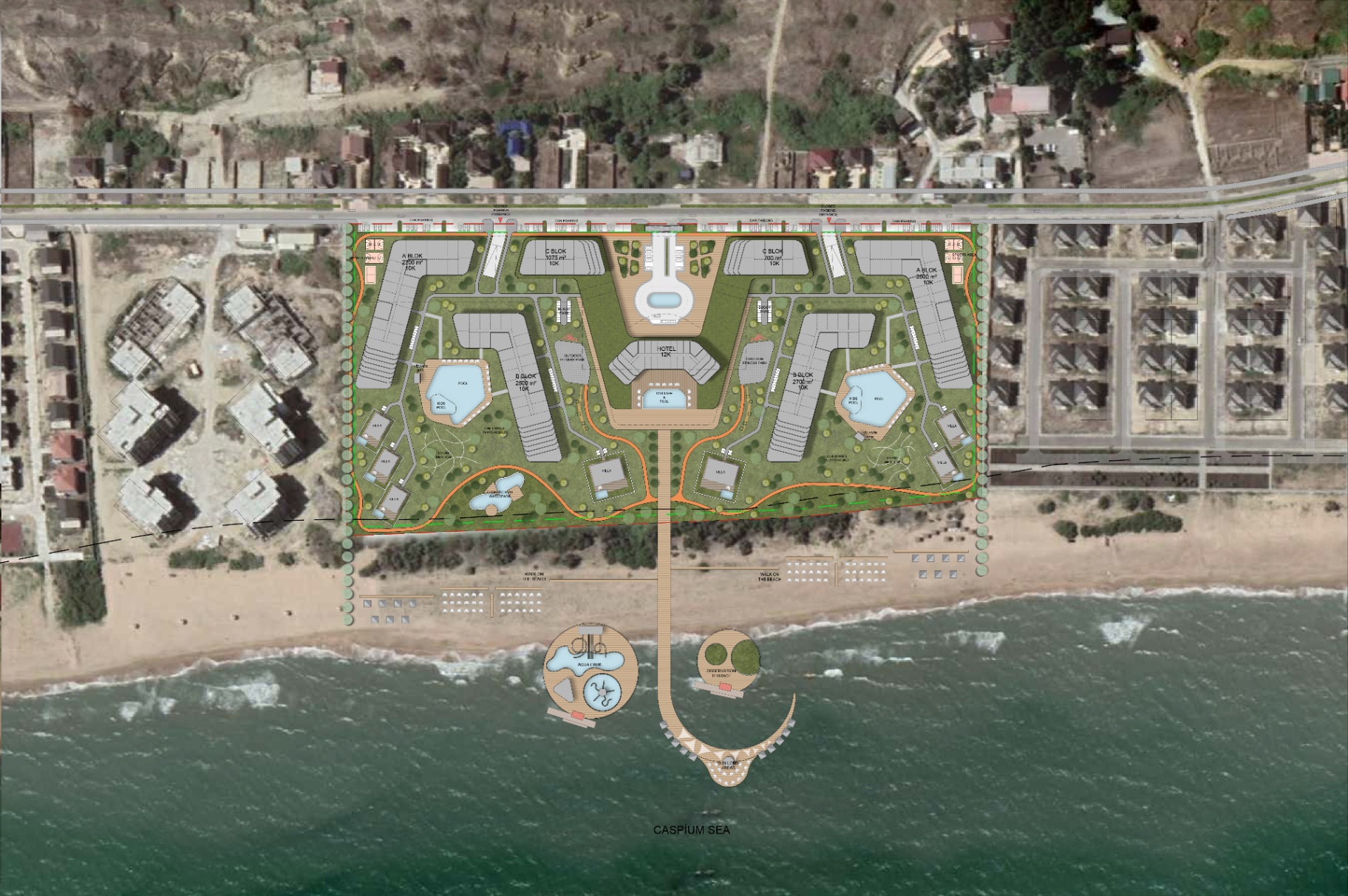 Rusya Federasyonu’na bağlı Dağıstan Cumhuriyeti’nin başkenti Mahaçkale’de, Hazar Denizi kıyısında konumlanan bu proje; sahil şeridinde yer alan özel bir arazi üzerinde tasarlandı. Doğrudan kumsalla temas eden yerleşim planı sayesinde kullanıcılar sahilden kesintisiz biçimde denize erişim sağlıyor ve manzara, yaşamın ayrılmaz bir parçası haline geliyor. Lüks rezidans, otel, seçkin villalar, alışveriş alanları, kültür merkezi, spor tesisleri ve geniş peyzaj alanları; bütüncül bir masterplan yaklaşımıyla kurgulandı. Projenin konsepti; sahil yaşamını modern ve zamansız bir mimari dil ile birleştirerek yüksek konfor standartlarına sahip, dört mevsim yaşayan prestijli bir kıyı yerleşimi oluşturmak. Kütle yerleşimi ve açık alan organizasyonu; mahremiyet ile sosyal etkileşimi dengelerken, doğal peyzajla entegre edilen mimari karakter güçlü ve sürdürülebilir bir yaşam vizyonu sunuyor.